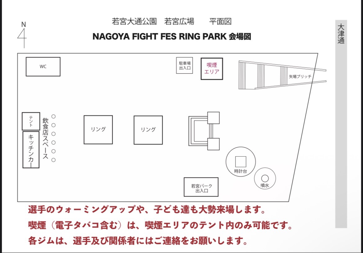 | 開催場所 | 若宮大通公園広場(名古屋市中区大須/公武堂前)特設リング ※2リング開催予定 ●公共交通機関でお越しの場合 地下鉄名城線「矢場町駅」4番出口から西へ徒歩5分 地下鉄名城線・鶴舞線「上前津駅」9番出口から北へ徒歩5分 |