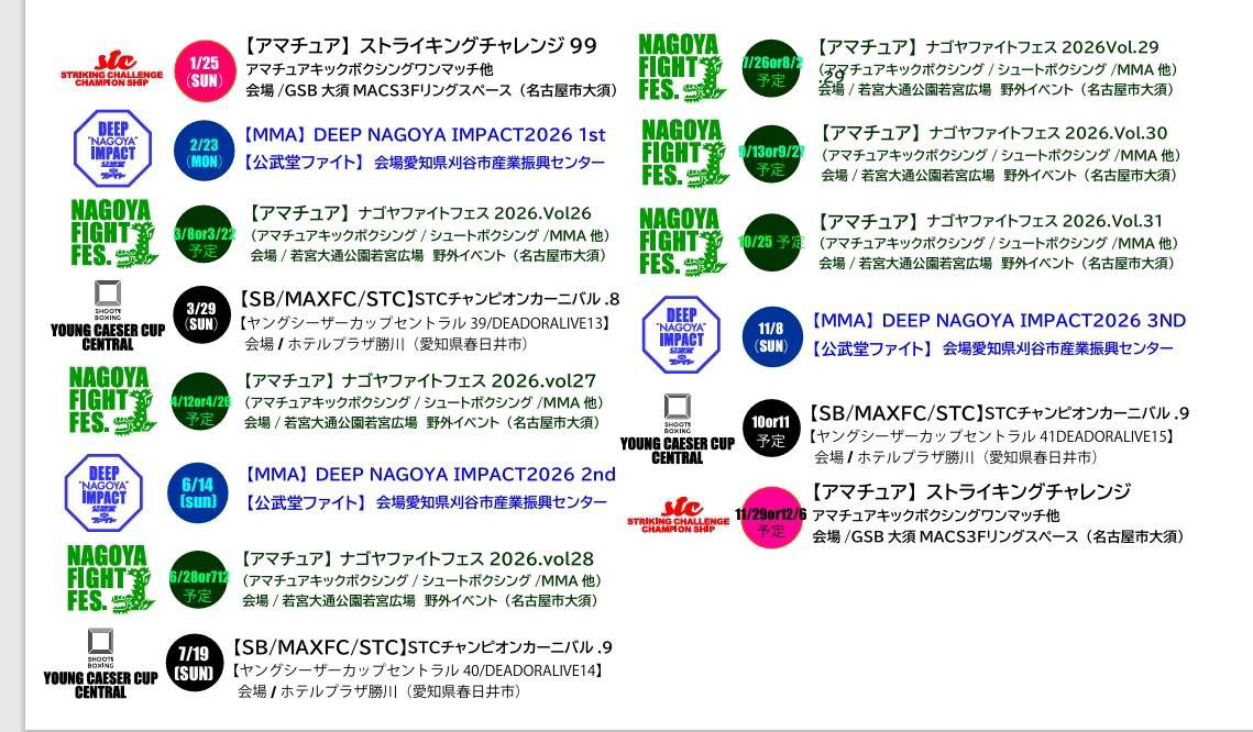 私たちは【格闘技】を通じて「豊かなライフスタイルの提案」「青少年育成」「地方活性化」「全国・世界への選手の輩出と交流」をテーマとしたアマチュア大会「NAGOYA FIGHT FES」(ナゴヤファイトフェス)ほか各大会をみなさまとともに運営しております。